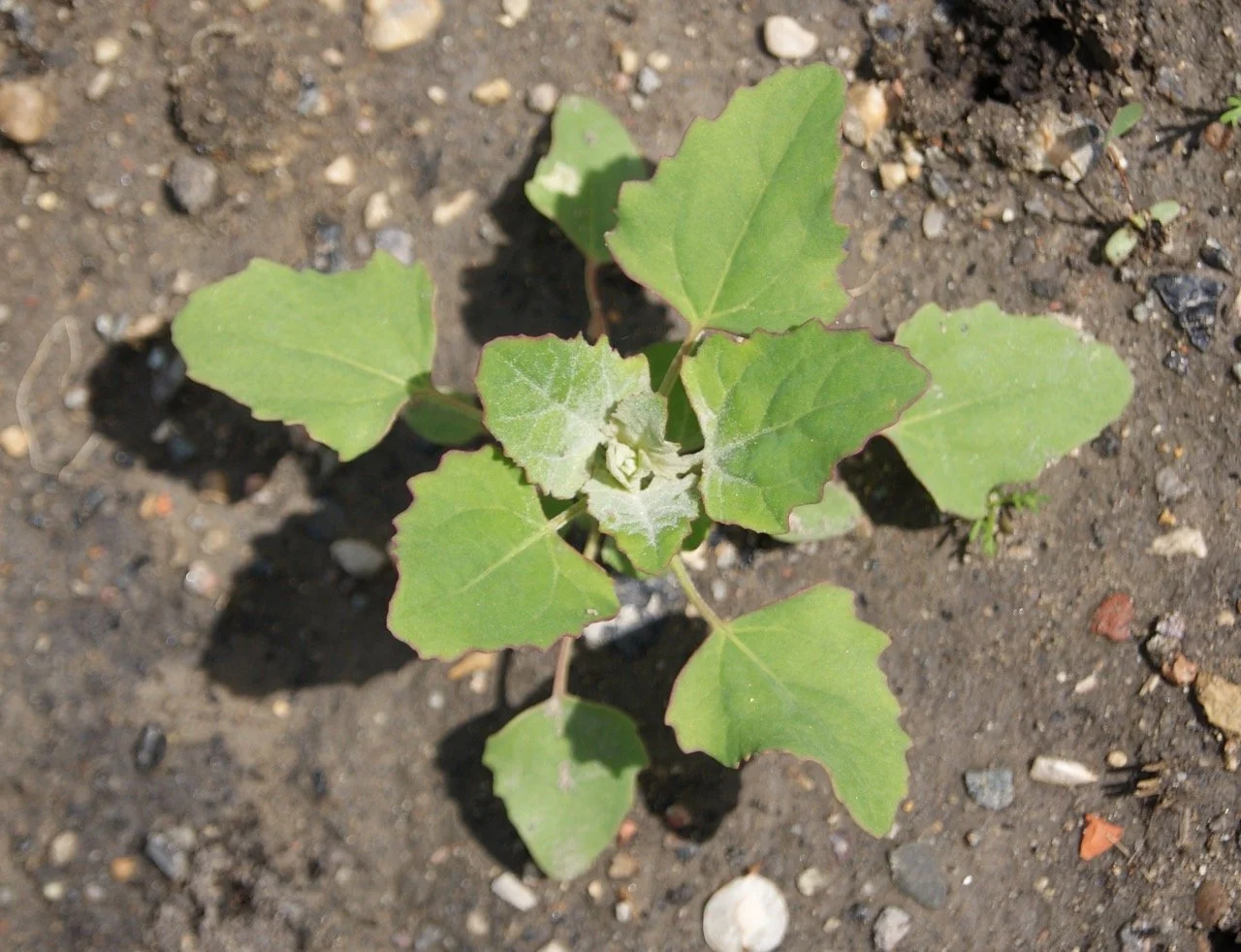 Lambsquarters is a fast-growing weed with young triangular, alternate leaves that are often coated with a white, powdery film. It can grow from 3 inches to 6 feet tall in a single growing season. It spreads by seed, so plants should be pulled and removed from the garden before seeds are set in late summer. Lambsquarters is also called wild spinach and can serve as a bait plant for leaf miners. It is commonly found in gardens and landscapes.