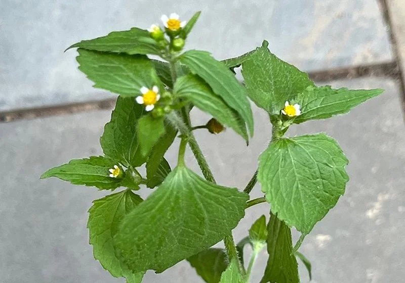 Hairy galinsoga grows well in nitrogen- and phosphorus-rich soils and is commonly found in fields, farms, and gardens. Seedlings start small with two opposite, rounded leaves. Mature plants have opposite leaves with toothed edges, and erect stems can reach 5 to 30 inches tall. Small white composite flowers produce thousands of seeds per plant. It spreads by seed. Remove plants promptly, including the roots, before they go to seed. Pulled plants can be mowed or composted if seed has not yet formed.